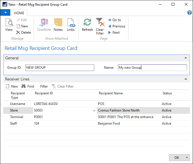 Recipients Groups can be created for Retail Messages. The groups can be selected in the Recipients FastTab in the Retail Messagecard for a quicker selection of multiple recipients. Open the Retail Message Recipient Group List: