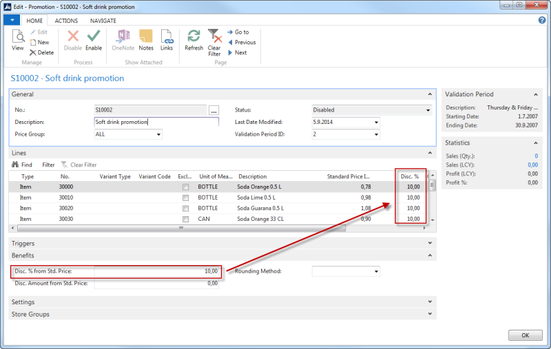 Open the Promotions page, select a line and click Edit.