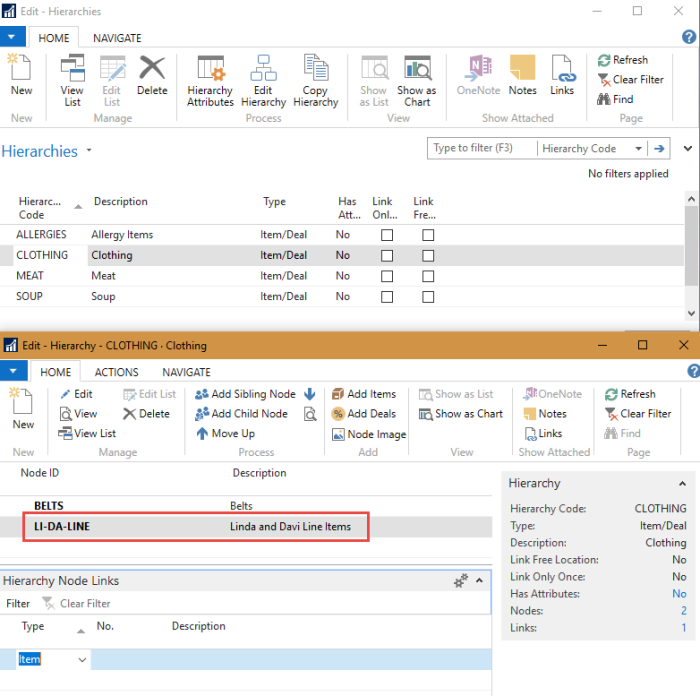 - In the Type column on the Hierarchy Node Links FastTab select Item .