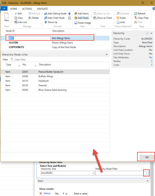 - You can add other filters and they will be added to the Attribute filters. For example, if you only want items from the DESSERTS item category, you can enter DESSERT in the Item Category Codefilter field on the Item FastTab, and only Items with Item Category Code = DESSERT that have Attribute NUT with Yes or Trace will be added to the node.