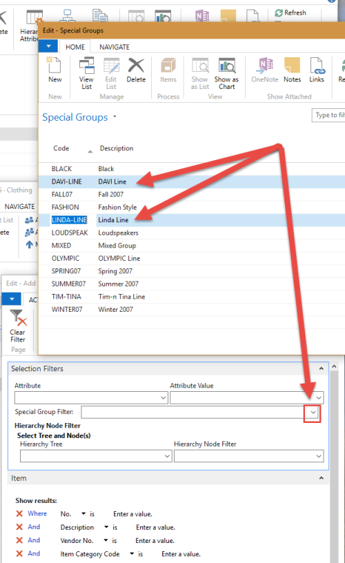 Click the Add Items action, and in the Special Group Filter field, click the arrow and select both the DAVI-LINE and LINDA-LINE Special Groups, and then click OK.