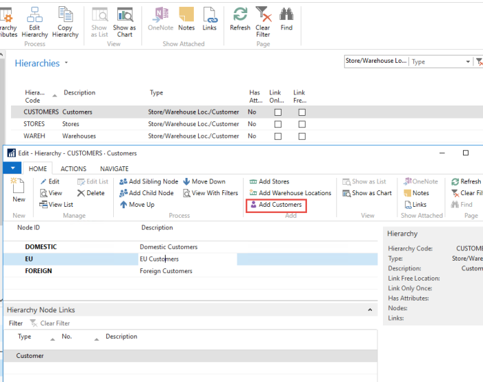 Your new hierarchy tree has a Node called CUSTOMERS with three child nodes, DOMESTIC, EU, and FOREIGN. You want to add to the DOMESTIC node all Customers with a Customer Posting Group = DOMESTIC.