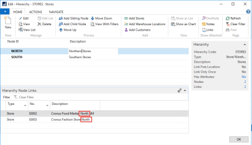 Click the Edit Hierarchy action, and in the Edit Hierarchy - STORES page, place the cursor on the NORTH line and click the Add Stores action.