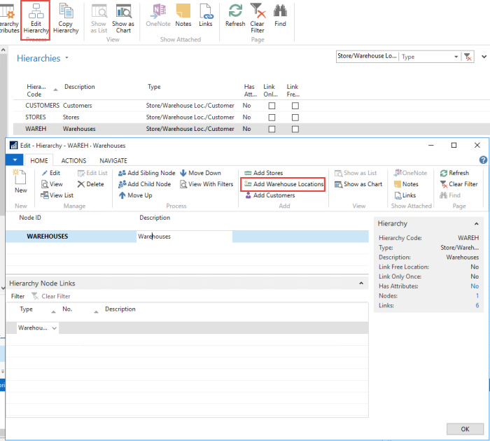 - Go to LS Retail - Back Office - Product Design - Hierarchies, select a hierarchy of the type Store/Warehouse Loc./Customer (the Type column), and click the Edit Hierarchy action.