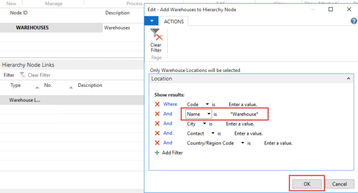 - Click the Add Warehouse Locations action, and fill out the filters to include only the warehouses you want to insert under your node.