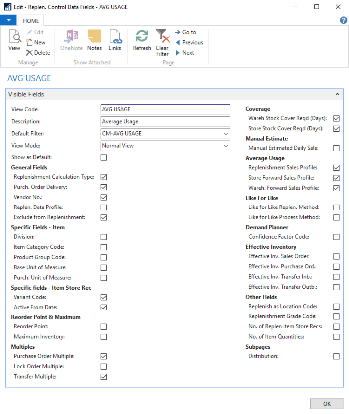 In the Replen. Control Data List page, you can use the Active Fields to display only the relevant fields that you want to view.