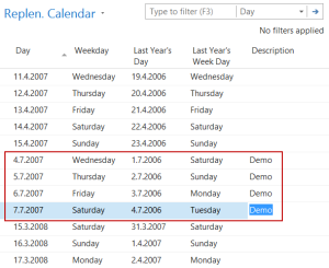 In the calendar, the user can set up the projection of days between years. This approach is used to map sales events which have a moving date in the year, such as Easter.