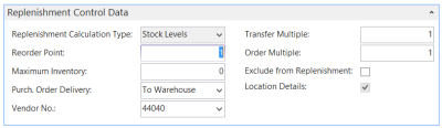 If you enter 10 in the Reorder Point field and 20 in the Maximum Inventory field, the Replenishment system will not suggest anything until the inventory drops below 10. If the inventory drops to 8, the system will suggest a quantity of 12 (Maximum Inventory – current inventory) to be ordered.  If the value in the Maximum Inventory field is zero, the system will suggest a quantity of 2 to be ordered.