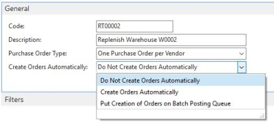 It is possible to have the system automatically create the document by selecting the value Create Orders Automatically in the field Create Orders Automatically on the Replenishment Template page for the Journal. This is used when executing the Replenishment Journal process as an overnight Scheduled Job.