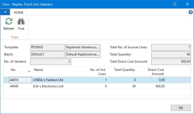 The Statistics form gives the buyer a good overview of the total quantity and direct cost of the Replenishment Journal. The detail lines show the quantity and direct cost down to each vendor in the Replenishment Journal.