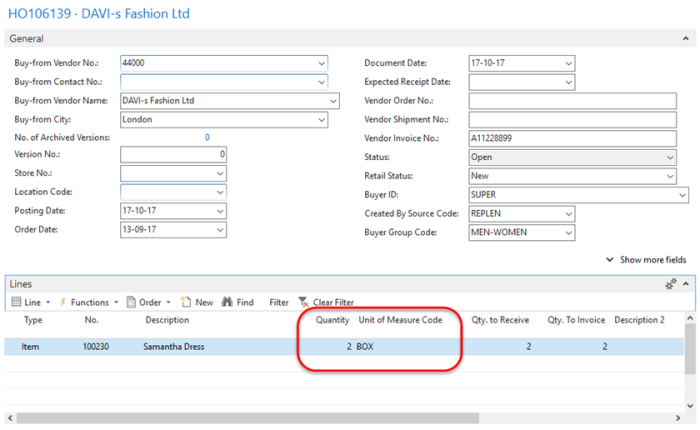 When the Purchase Order is created from the Replenishment Journal, the quantity to be ordered for Samantha Dress will be converted to 2 BOX since 100 PCS is a full multiple.