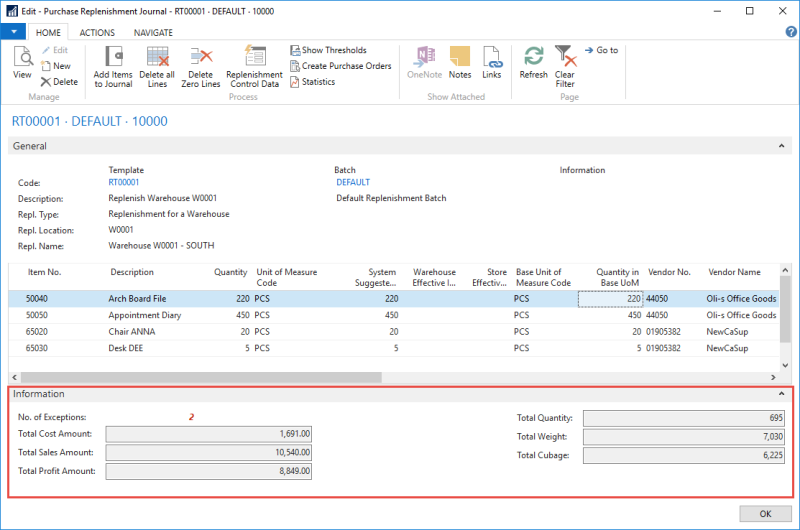 in the Replenishment Journal Detail Lines and aggregates the values to Replenishment Journal Lines and the whole Replenishment Journal. The total values for the Replenishment Journal can be seen on the Information FastTab.