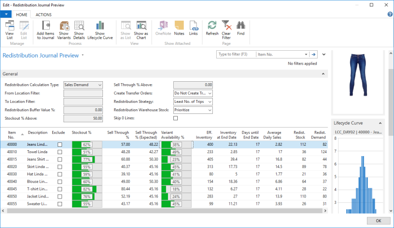 When the Preview is calculated, the Show Redist. Preview action opens the Redistribution Journal Preview page where you can view the calculated Redist. Demand and Redist. Stock information of the items. Click here for more information on how Redist. Preview is calculated.