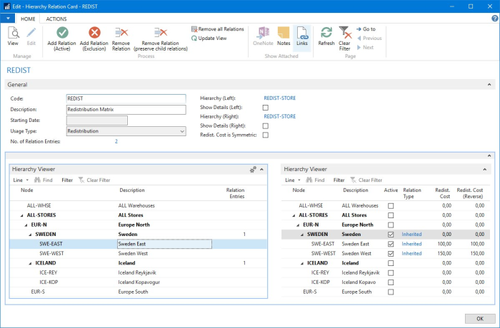 The Redist. Matrix is used to define possible store and warehouse location combinations to calculate Transfer Orders in Store Stock Redistribution (Trips). This enables a retailer, which operates stores in multiple countries, to define that only stores within the same country should be considered when the trips are calculated. The Redist. Matrix is based on Hierarchies and Hierarchy Relations and allows a top-down definition with inheritance.
