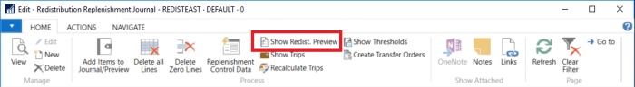 If the field Create Journal Lines in the Replenishment Template is set to Create Redist. Preview Only, the report will only calculate the Preview and will not create Journal Lines. This lets the user review the result before the Replen. Journal Lines are created. For more information see How to: Set Up Redistribution Templates .