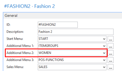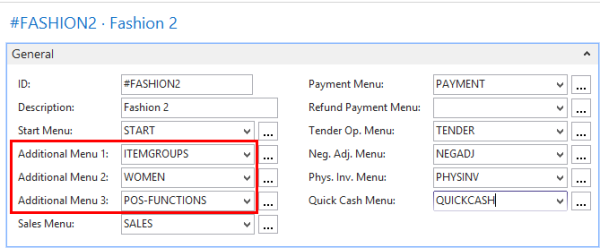 On the Menu Profile Card, the General FastTab, there are some fields to configure which menus are used for certain conditions; these are either for fixed POS commands or for the relevant the POS Sales Mode.