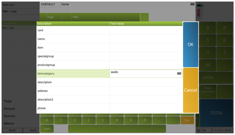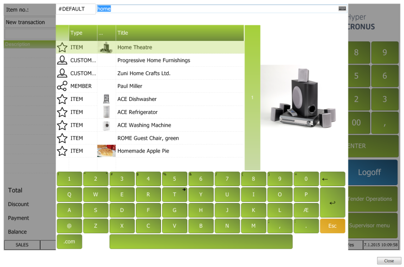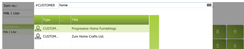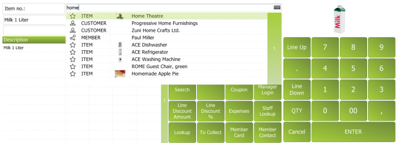 This picture shows the Search Dialog running the #DEFAULT Search Setup. Typing home into the input control shows result from 3 indexed tables, ITEM, CUSTOMER and MEMBER. Now we can select any one of the results and the active POS Transaction will be updated depending on the type of record we choose. Double clicking on a record will insert the record without closing the Search Dialog.