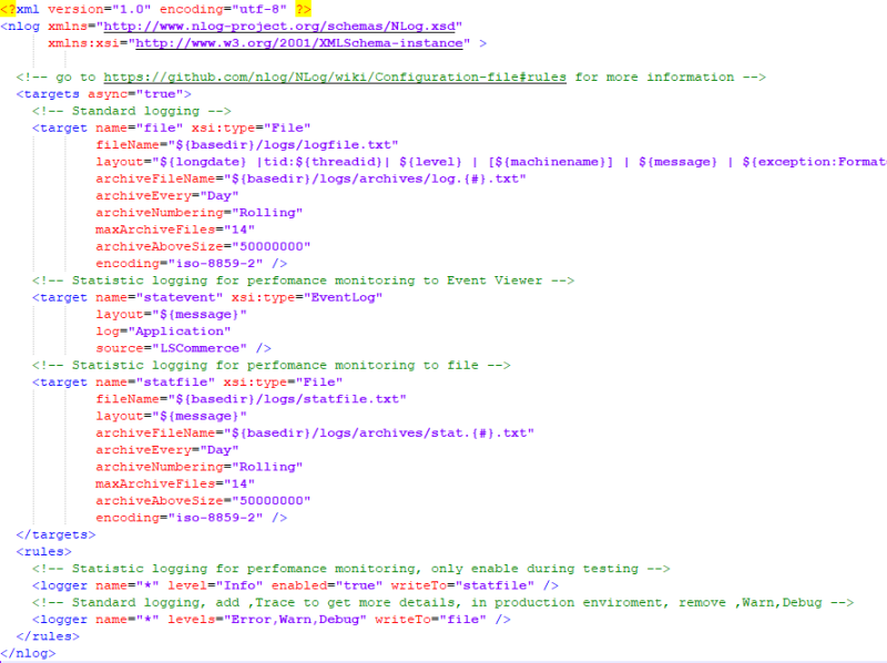 The logging configuration settings used are stored in the NLog.config file, which by default is located in C:\LS Retail\LSCommerce\LSCommerceService\. The logger “levels” key determines how much logging is done. It can be Error, Warn, Debug, and Trace. Default setup has Error, Warn, Debug set, but production “levels” should be Error only.