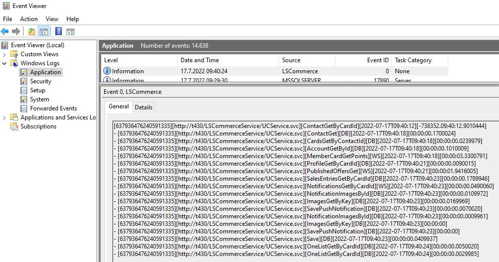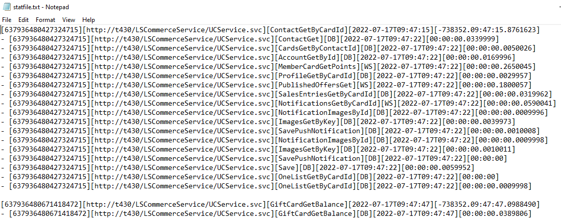 To analyze performance and the time it takes for a function to run, you can turn on statistic logging. Logging can be done to a statfile.txt that will be located in the C:\LS Retail\LSCommerce\LSCommerceService\logs folder or to the Application folder in Event Viewer.