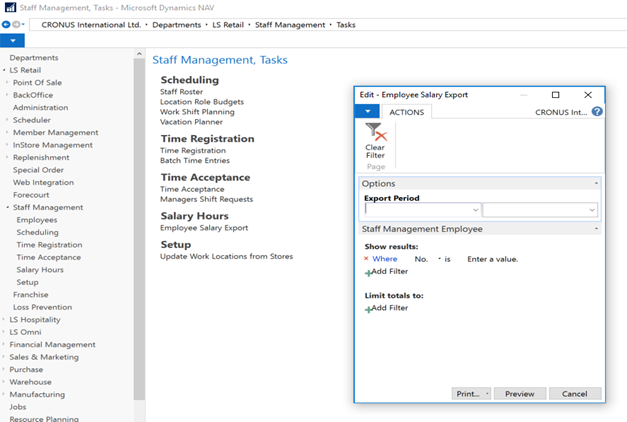 When the salary period needs to be closed and sent to the salary module, then no salary entries can be open and undecided within that same period. From the Staff Management role center actions menu there is a function Close Period, which allows the manager to close the period dated from when the last closing process was done (for the location), and until current work date.