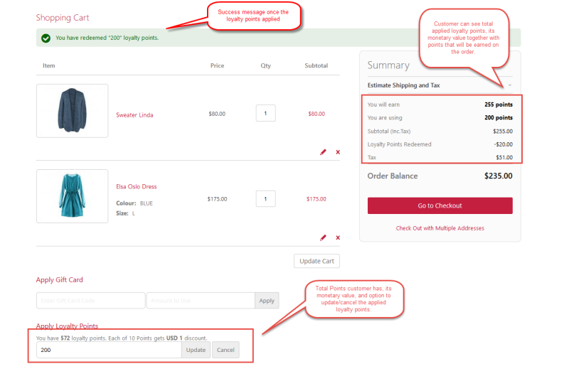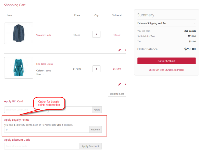 - Option for loyalty points redemption will appear on the shopping cart and checkout pages.