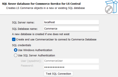- Select the Create and use CommerceUser to connect to Commerce Database check box to let setup create CommerceUser with default password CommerceUser and use that user as login for the Commerce database. If this check box is not selected, the SQL credentials will be used to connect to Commerce database.