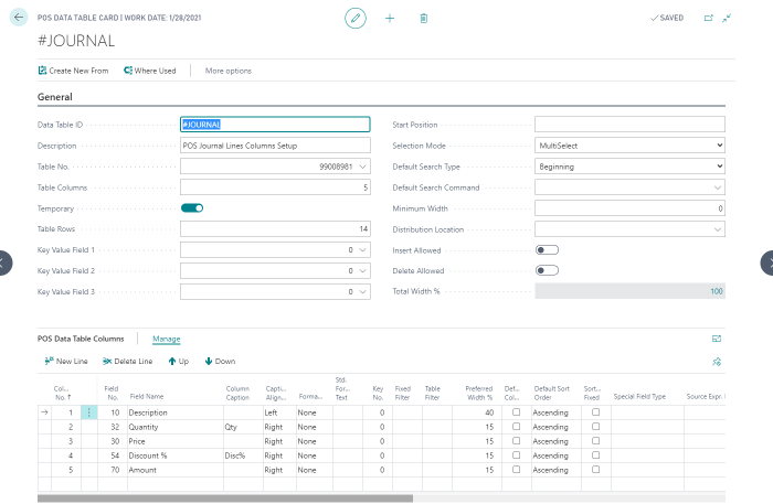 Note: For certain data tables, such as the journal data tables, you can assign a POS command to a data table column. This is a great benefit for the POS, if you assign commands to the columns the need for buttons on the POS decreases.