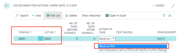 This topic explains how to block a lot number, so that when the item's GS1 DataBar barcode is scanned, the user will be informed that the item is blocked. For this example, the producer of 38001 - Aspirin has notified the retailer that the lot 10001 had an error during production and must be recalled.
