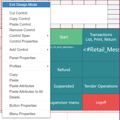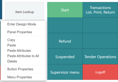 When the POS is in the design mode, you can right-click and from the drop-down list change the design of panels, buttons and so on the active profile for the POS.