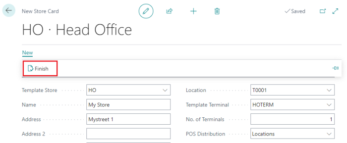 Then click the Finish action and the system creates the new store and terminals, with the same parameter settings and related setup, like Tender Types and so on, as the templates.