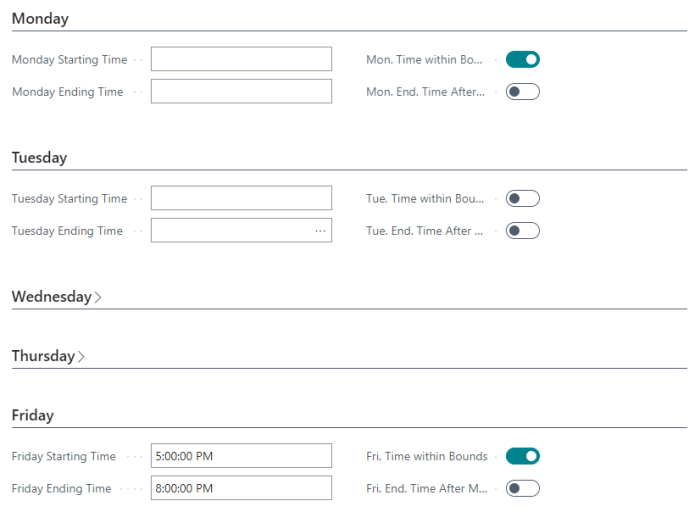 - If the period is to have different time constraints per day you can define Starting Time and Ending Time for each day. This is helpful for offers such as happy hour that occurs Mon-Thurs but might have different hours on Friday.