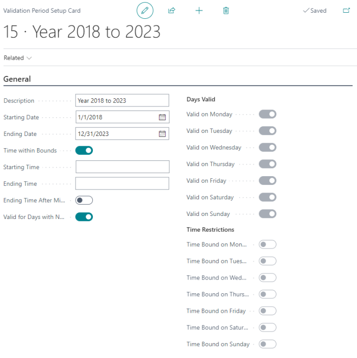 Validation periods are used to define specific date ranges, day of week and time ranges for retail actions to apply. This includes deals, promotions, price changes/discounts, and so on. These are typically used to define start and end dates for special pricing (sales, promotions, and so on) as well as special pricing such as discounts on Tuesdays and happy hour pricing.