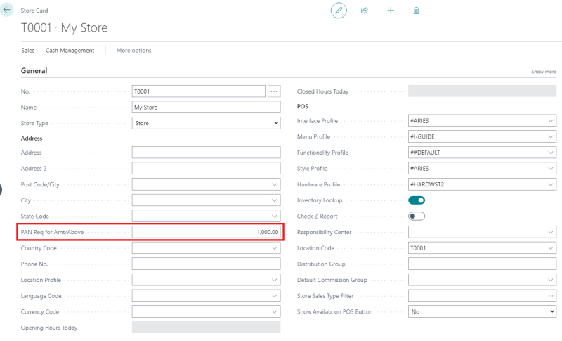 In the General FastTab, set the amount limit where a PAN number is required or mandatory. For example, if the limit is set to 1000 Rupees, customers must provide a valid PAN number for transactions exceeding this amount.