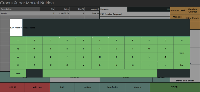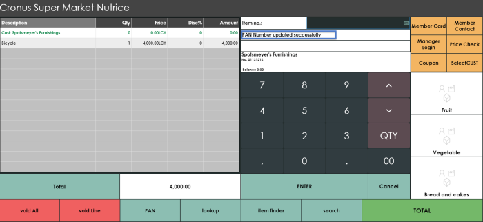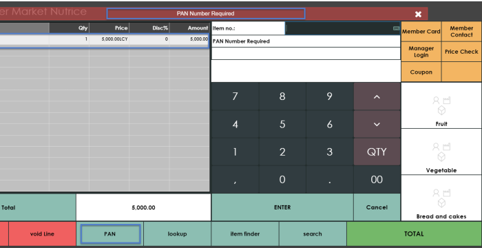 For example in POS, if the item's price added to the sale line is 5000 Rupees, which exceeds the store's setup limit of 1000 Rupees, the system will prompt for entering the PAN number.