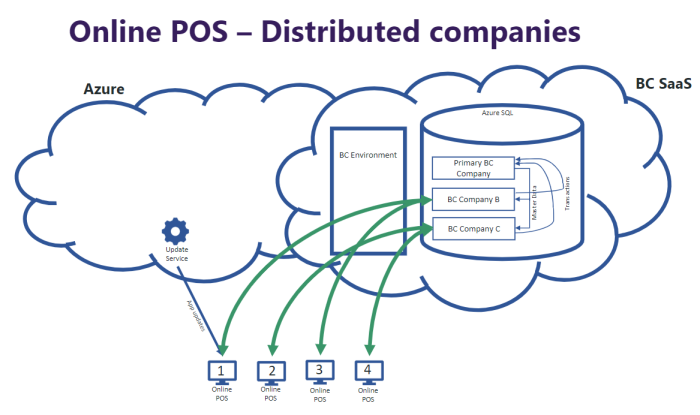 LS Central in SaaS supports the option of multi-company architecture, an example is when a customer prefers to distribute the POS terminals between companies, replication of master and setup data to the POS companies could be achieved with Web Replication. Transactions are replicated to the master company using POS web services.