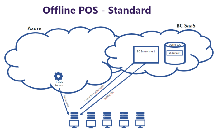 The offline POS gives customers the ability to take advantage of the benefits of cloud hosting and the resilience of an offline POS. The customer can choose to have each POS with a dedicated database or to connect the POSs to a store server. The POS or the store is running fully offline, with online functionality using POS web services. Transactions are sent to HO in SaaS using web services (Send Transaction).
