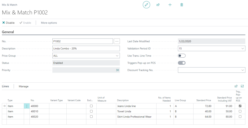 The last offer type is Mix & Match. It is a more versatile type of offer since it can be triggered by a combination of factors, such as Items, Product Groups and Variants, Discounts can be in the form of a deal price, a discount amount, a discount percentage, least expensive or be specified for individual Mix & Match lines.