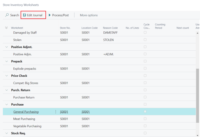 icon, enter Store Inventory Worksheets and select the relevant link. - Select a worksheet of the Type Purchase, and click the Edit Journal action to open the worksheet journal:
