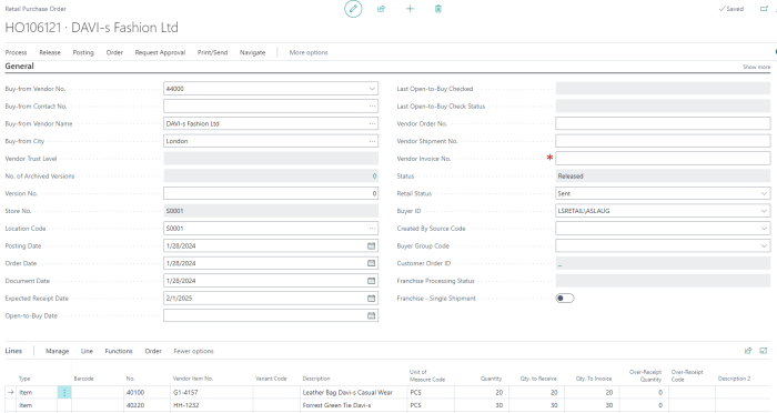 - Fill in the required details, such as Vendor No., Vendor Invoice No., and add item lines.