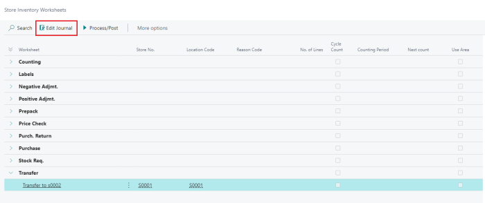 Select a worksheet of the Type Transfer, and click the Edit Journal action to open the worksheet journal: