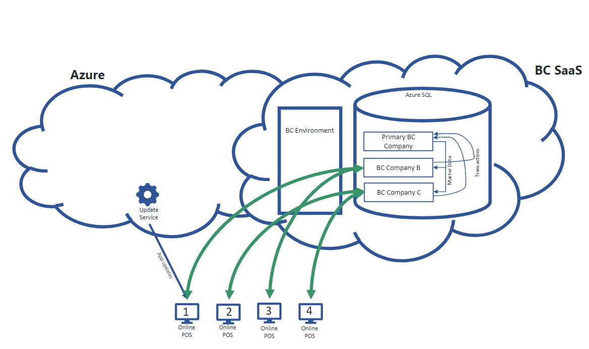 LS Central in SaaS supports the option of multi-company architecture, an example is when a customer prefers to distribute the POS terminals between companies, replication of master and setup data to the POS companies could be achieved with Web Replication. Transactions are replicated to the master company using POS web services.