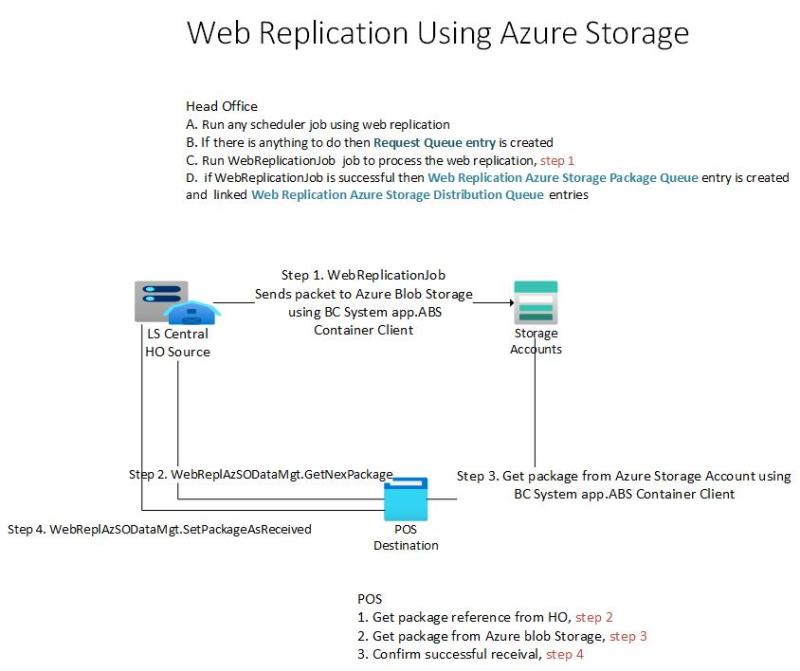 This is an addition to web replications that utilize Azure Storage Account to distribute data packets from Head Office (the source) to stores or POS terminals (the destination). The process to set up what data to send and to which location is the same as before. You set up a Scheduler Job and a Scheduler Subjob to define the date and the source location and the destinations.