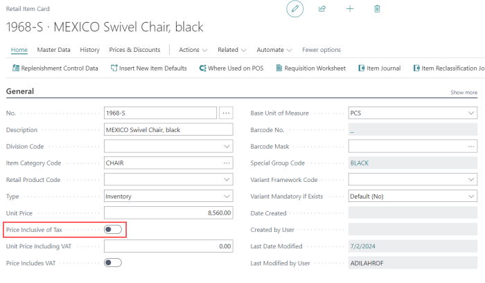 icon, enter Retail Item List and select the relevant link. - For each item, specify whether the price is inclusive or exclusive of tax. For example, if the item's price is inclusive of tax, enable the Price Inclusive of Tax toggle. This includes the tax amount in the unit price of the item.