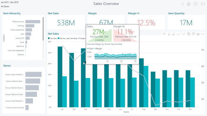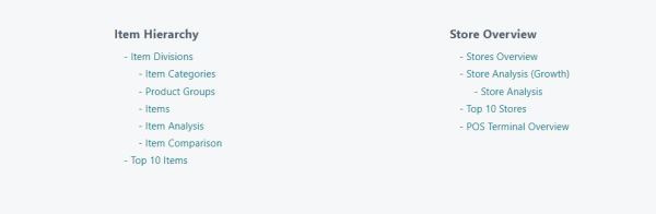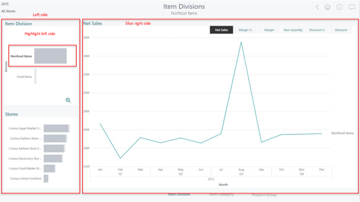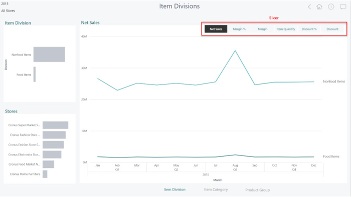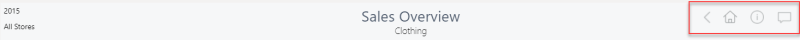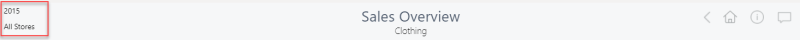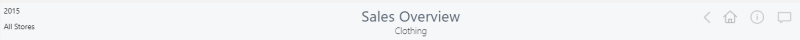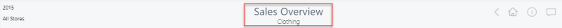 In the center, the title of the report is displayed, and if some slicing is being done on the item hierarchy it is displayed below the title. In this example the clothing category has been selected. If you drill through to a more detailed item hierarchy report, some information should always be displayed below the title.