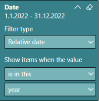- Relative date – dynamic date period, see the date example above which only shows data for this year.