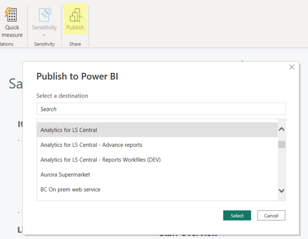 - Publish the report to the Power BI service. We recommend that you create a workspace for the report and publish to that workspace (optionally, you can create a test workspace and try out the product and updates there).