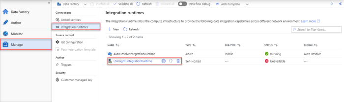 - Then click Refresh in the Integration runtimes overview window to view the status for Analytics-integrationRuntime. After you refresh, the status should be Running.