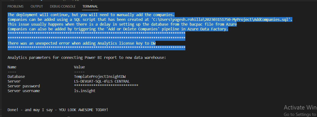 Once the database import has completed, you need to manually add the companies before triggering the Initial load in the Azure Data Factory. An SQL script file named AddCompanies.sql has been created in the My-Project folder in the Base folder, that can be used on the Analytics database to add the companies. The script executes the stored procedure [dbo].[LSInsight$InsertCompany] with the name of each company.