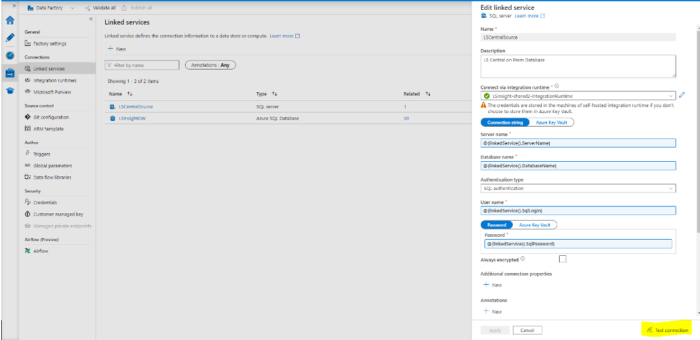 To make sure that your server, database, and user credentials are working, you can connect through SQL Server Management Studio on the machine where you are going to set up the integration runtime gateway, and verify that you can connect to and run a SQL query on the database or do test connection from the LSCentralSource linked service in the ADF.