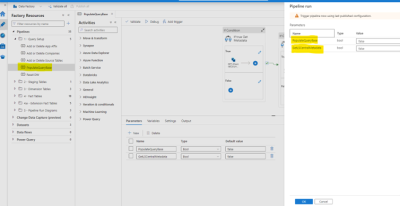 If there are new staging tables added to the Analytics database, you will need to run the Populate Querybase pipeline in ADF in order to create the table and the SQL commands needed to copy and transform the data from LS Central to Analytics. The Populate Querybase pipeline has two input parameters, PopulateQueryBase and GetLSCentralMetadata. Set the PopulateQueryBase parameter to TRUE, the GetLSCentralMetadata should only be set to TRUE if there are new tables added to LS Central that need to be added as a staging table in the Analytics database.